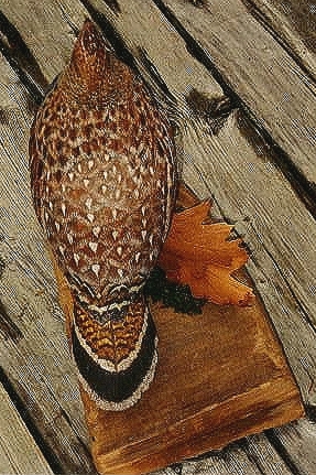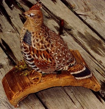......The Ruffed Grouse is a very well camoflaged, and dramatic bird both in appearance and in action. In spring the 'drumming' can be heard for nearly 1/2 mile.The full size bird can stand 17 inches high. This carving is about 12 inches tip to tail. It is carved from local basswood and painted in acrylics. It placed 1st in the intermediate division at the Buckhorn Carving show and HM in the Loyalist College Carving show in Belleville, Ontario. SOLD |