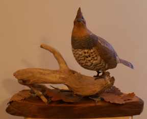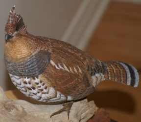 ......The Ruffed Grouse is a very well camouflaged, and dramatic bird both in appearance and in action. In the springtime, the 'drumming' can be heard for nearly 1/2 mile. The full size bird can stand 17 inches high. This carving is a red phase' grouse, about 10 inches tip to tail. It is carved from tupelo and painted in acrylics. It stands on a natural piece of driftwood over a bed of late autumn leaves and placed on a strip of lightly polished cherrywood. The Grouse is a medium to large game bird with a plump body and feathered legs, the male being larger and more conspicuously colored than the female. • Family Tetraonidae (or Phasianidae): several genera, esp. Lagopus and Tetrao. The family also includes ptarmigans, capercaillies, and prairie chickens.• the flesh of this bird can be eaten as food. This bird is SOLD |